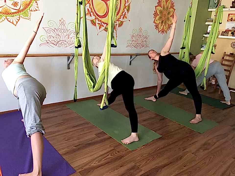 С помощью гамака мы делаем упражнения на растяжку и вытяжение позвоночника, проработку суставов. Гамак в этом случае даёт дополнительную опору, а Pin-Up помогает улучшить вытяжение в мышцах... а сомой главное это состояние невесомости, легкости и позитивный настрой в шавасане (в низком гамаке).
